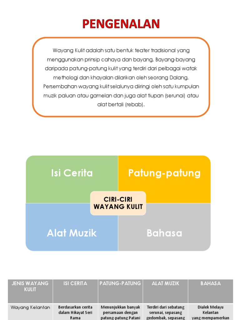 Ciri ciri wayang kulit. Wayang Kulit Gaya Yogyakarta Yogyakarta merupakan pusat pemerintahan dan kegiatan kebudayaan kesenian pada masa dilam tepatnya setelah kerajaan Mataram dibagi menjadi dua yaitu Kerajaan Surakarta dan Kerajaan Yogyakarta Ngayogyakarta Hadiningrat yang masging-masing mempunyai kedaulayan sendiri-sendiri. Persamaan Perbezaan Ciri-Ciri Wayang Kulit PERSAMAAN BERBEZAAN WAYANG KULIT P ersamaan dan P erbezaan wayang kulit khususnya bagi empat jenis wayang kulit yang telah dibincangkan sebelum ini dapat dilihat berdasarkan kepada beberapa ciri utama wayang kulit itu sendiri seperti asal usul isi cerita bahasa yang digunakan bentuk patung watak dan alat muzik yang digunakan dalam persembahan wayang kulit.